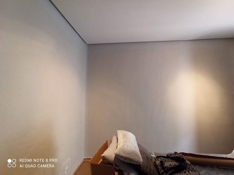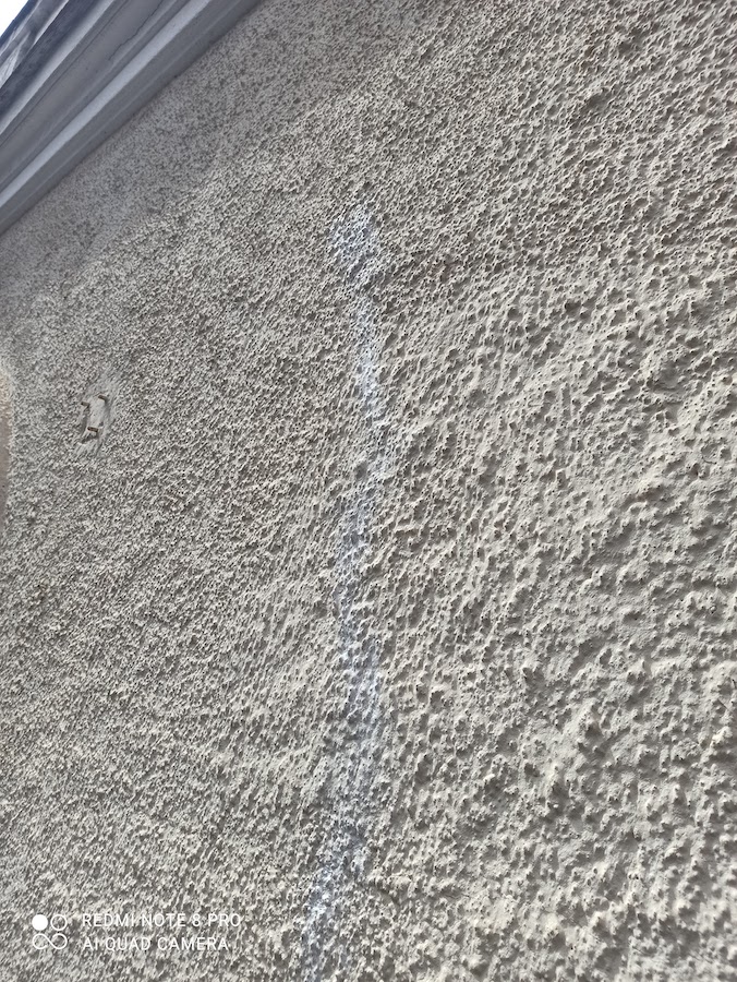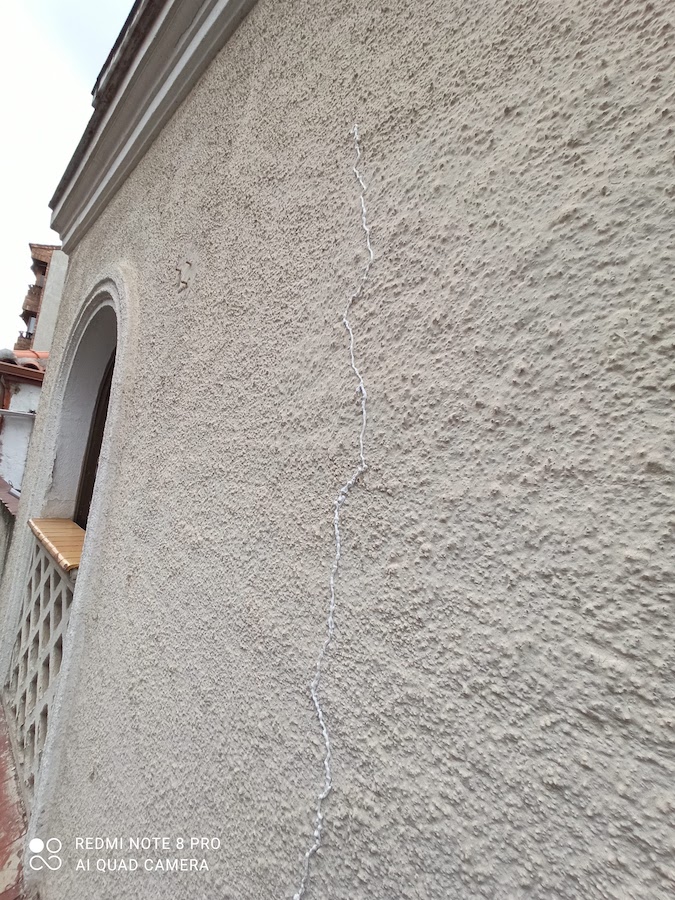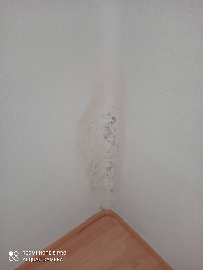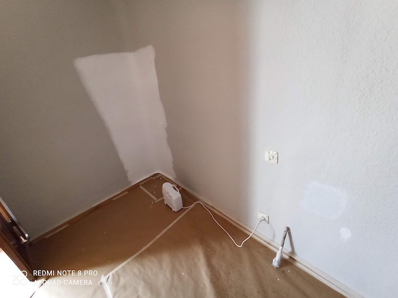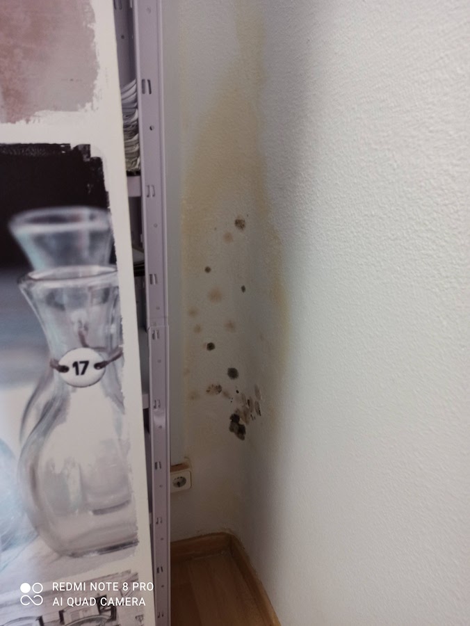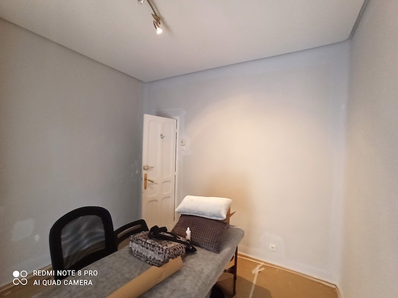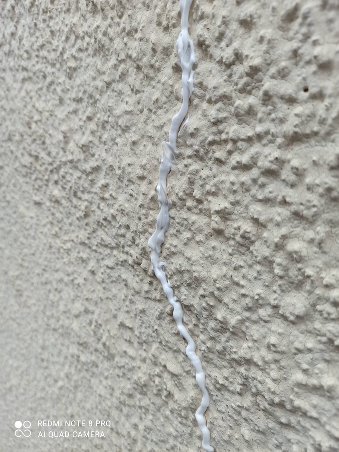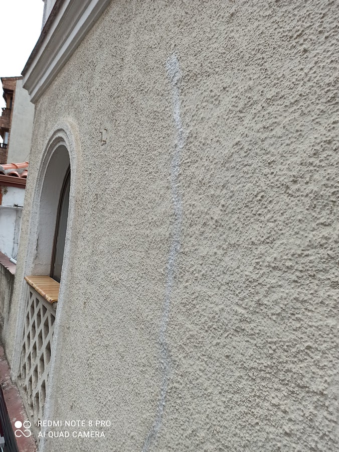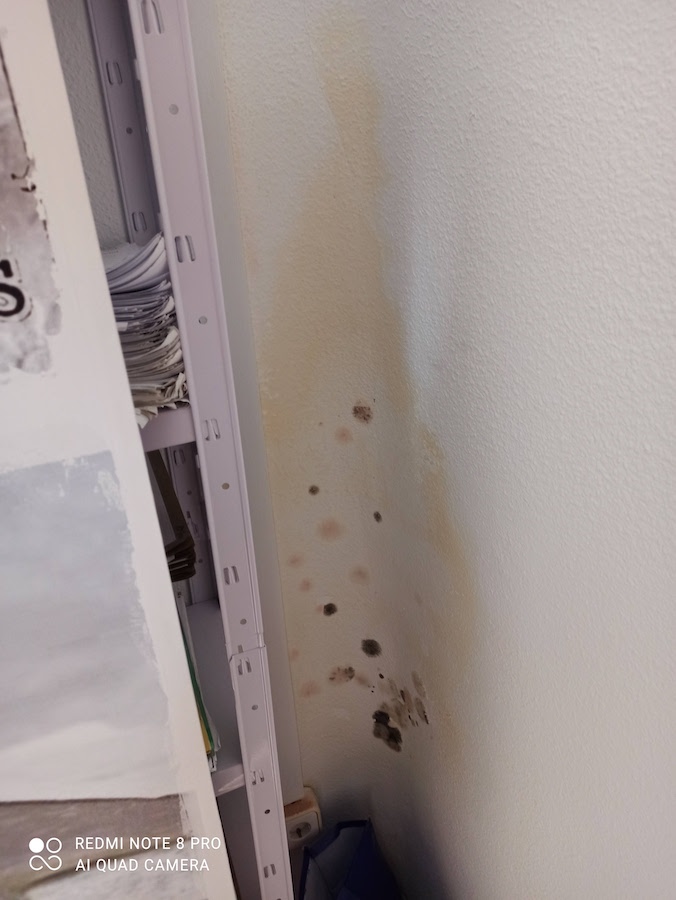 En la fachada se hizo una grieta coincidiendo en la parte de dentro del edificio con una esquina filtrando agua y terminando con humedades hacia dos de los despachos. Hubo que sellar la grieta con silicona y pintar con el color igual al de la fachada y en las habitaciones se aplicó quitamanchas y una se pintaron las paredes en gris claro y otra en color blanco, los dos techos fueron en blanco también.