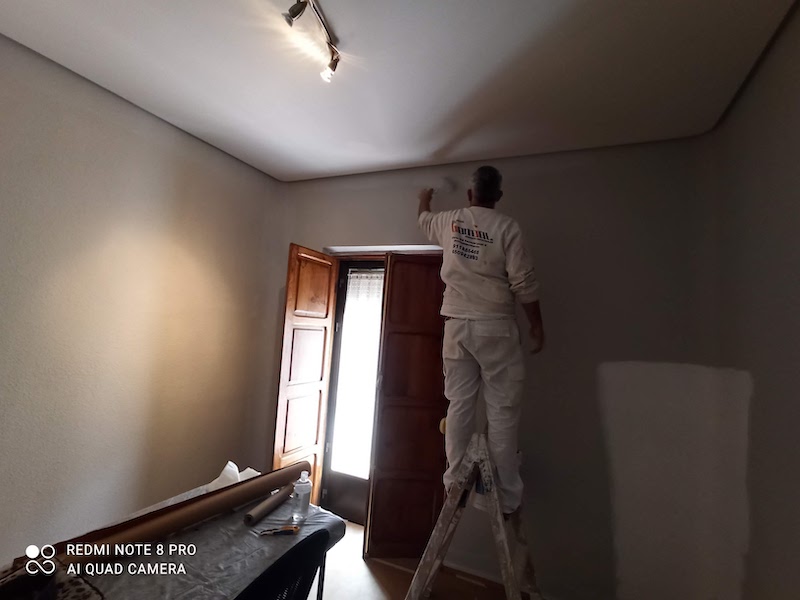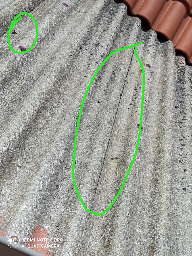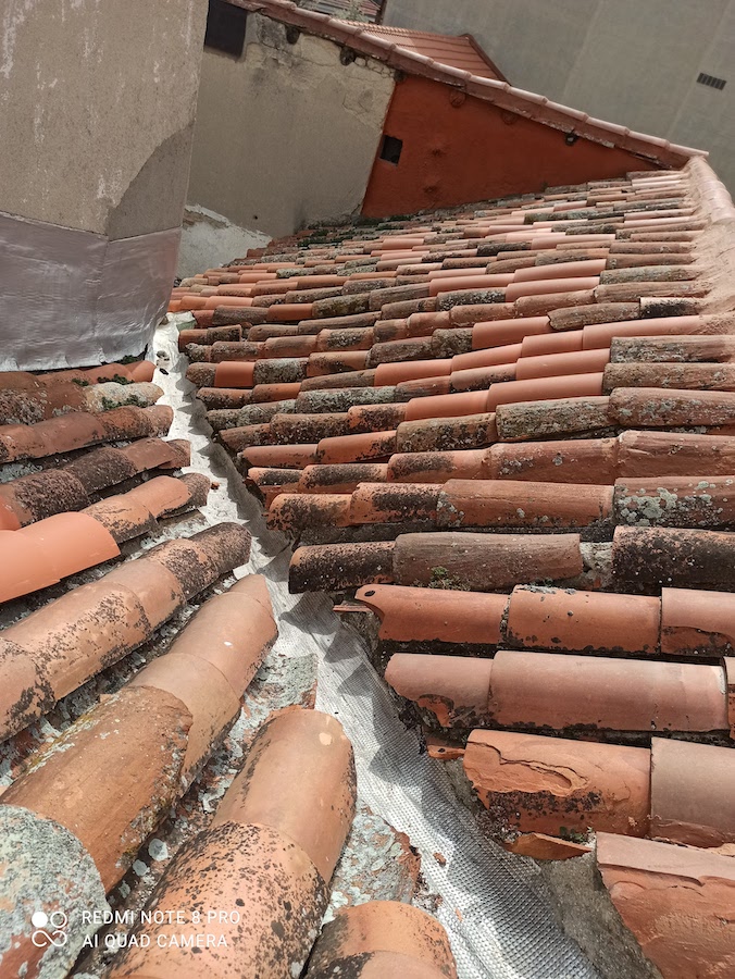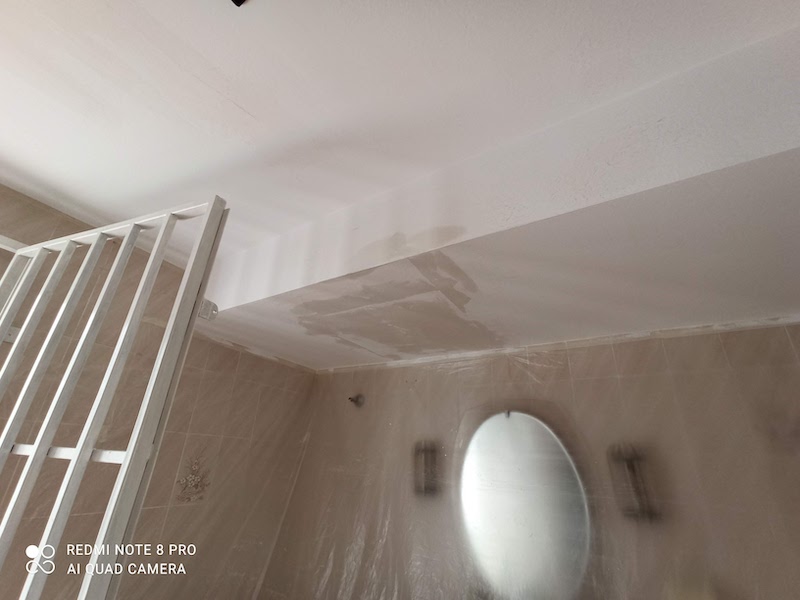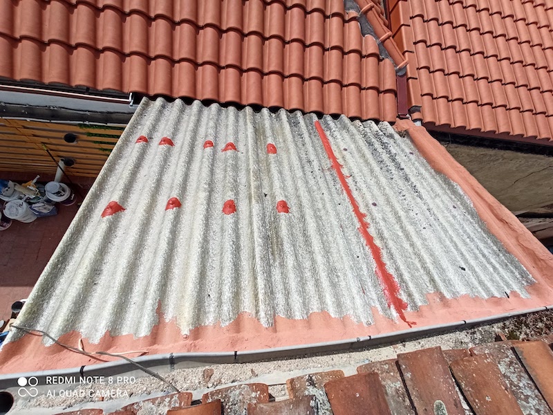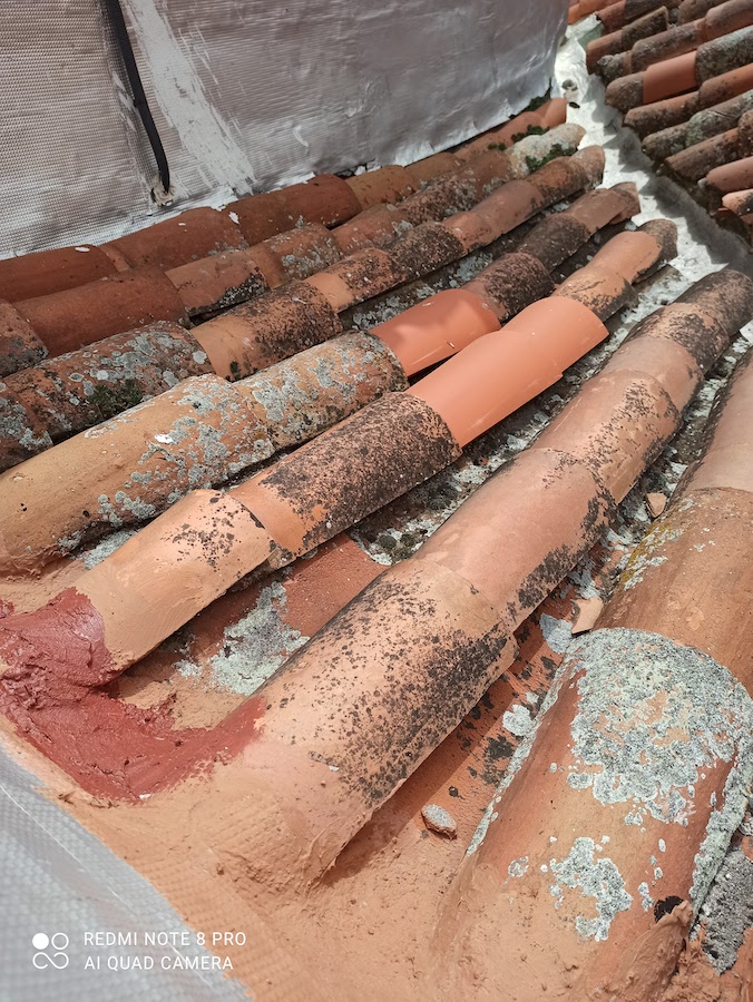 El local está un edificio de una planta y el mismo está en la primera planta, y en la parte del baño se movieron las tejas del tejado, se hizo otra grieta del peso de la nieve y se filtraron también humedades. Hubo que retirar las tejas dañadas, arreglar la avería y sustituir unas doce tejas nuevas. También aplicamos caucho en algunas grietas que observamos para prevenir futuras filtraciones. Y en el interior, se lijó el techo, aplicamos quitamanchas y velo y pintamos con pintura plástica color blanco.