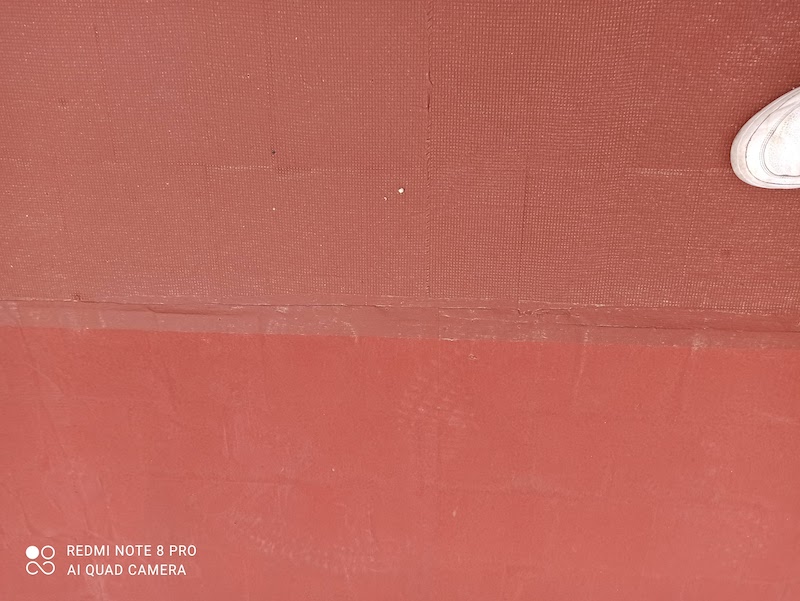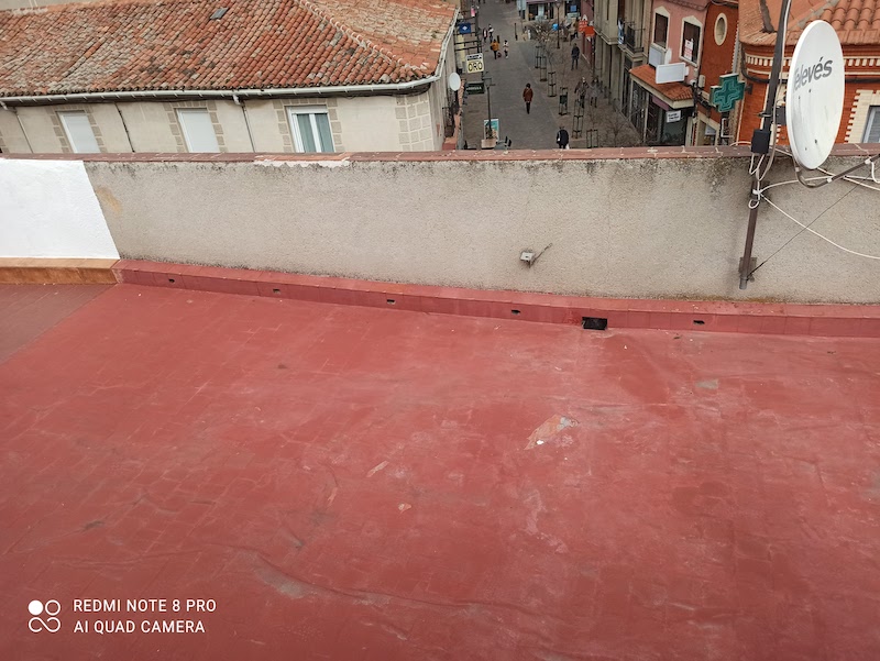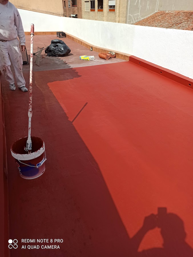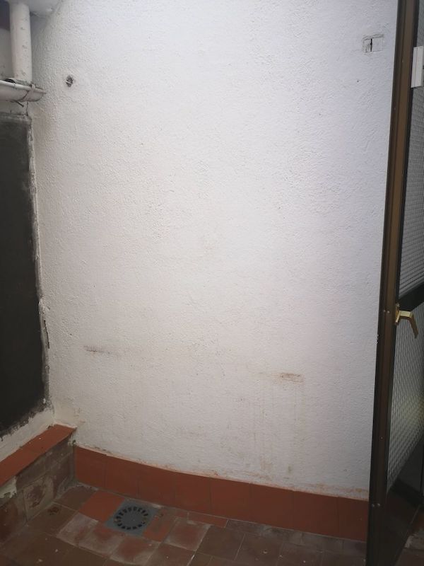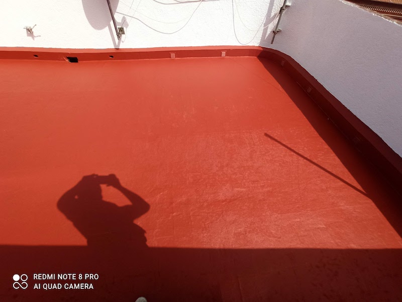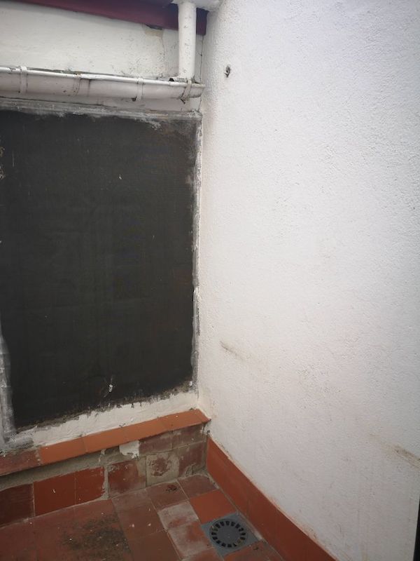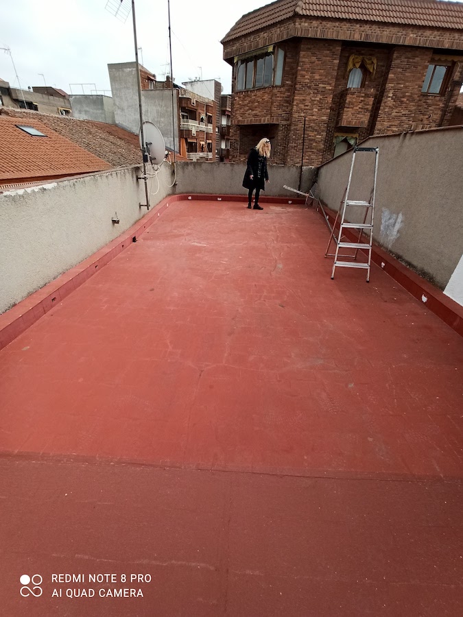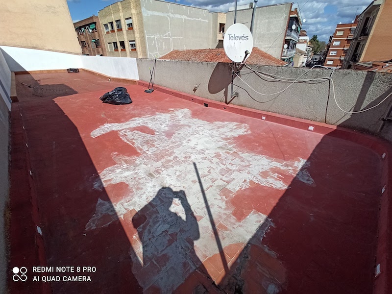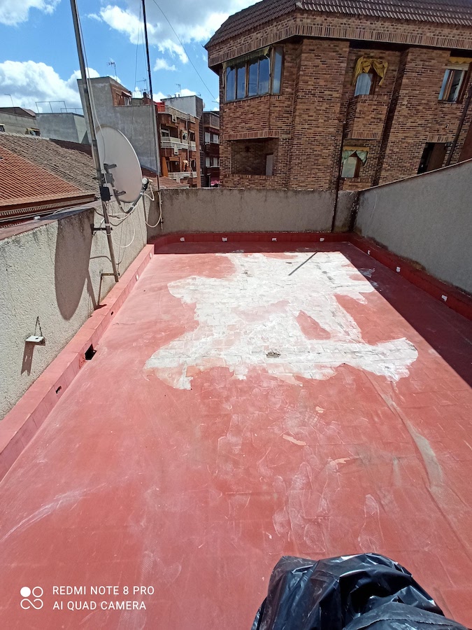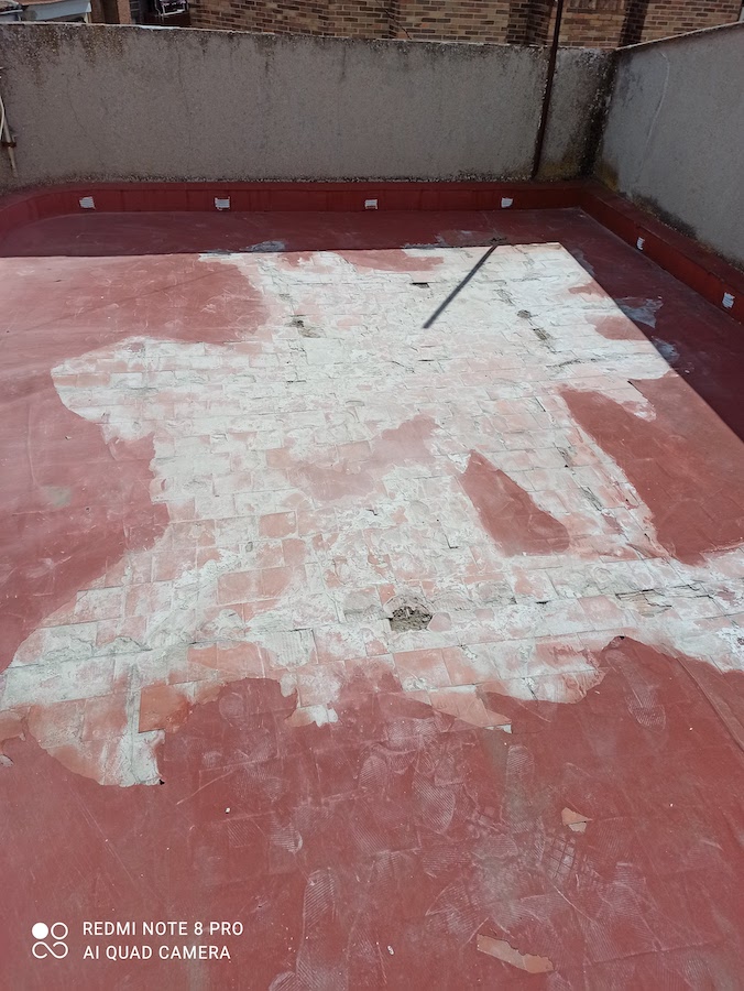 En la azotea, hubo que raspar el suelo y un velo incorrectamente instalado (ya que le indicamos a la clienta que ese tipo de velo suele instalarse en paredes no en suelo), reparar dos plaquetas catalanas que estaban obstruidas y por ahí también existían filtraciones, aplicar una pasta niveladora y pegar una fibra de vidrio que se instala en las azoteas para proteger, después dos capas de pintura de membrana de caucho.