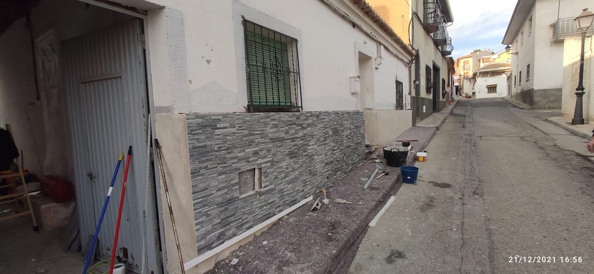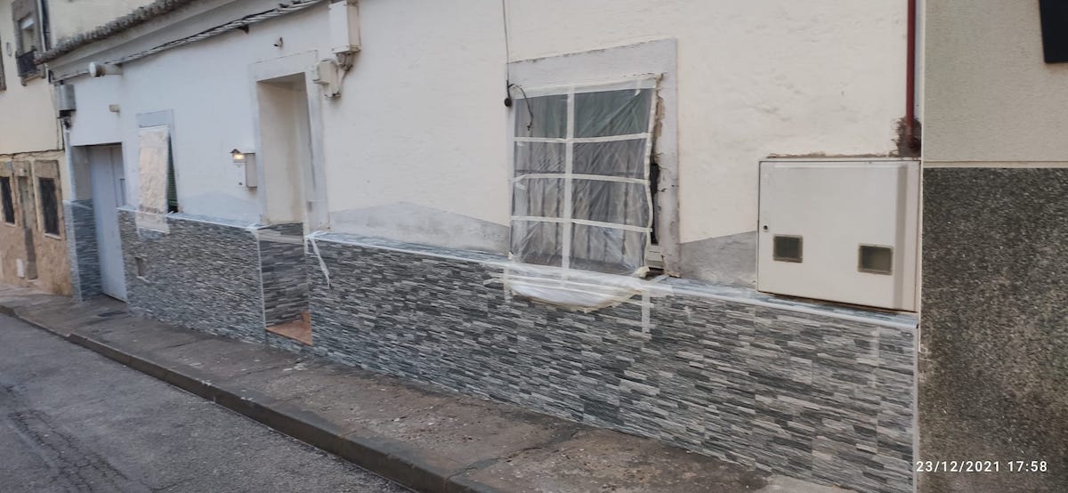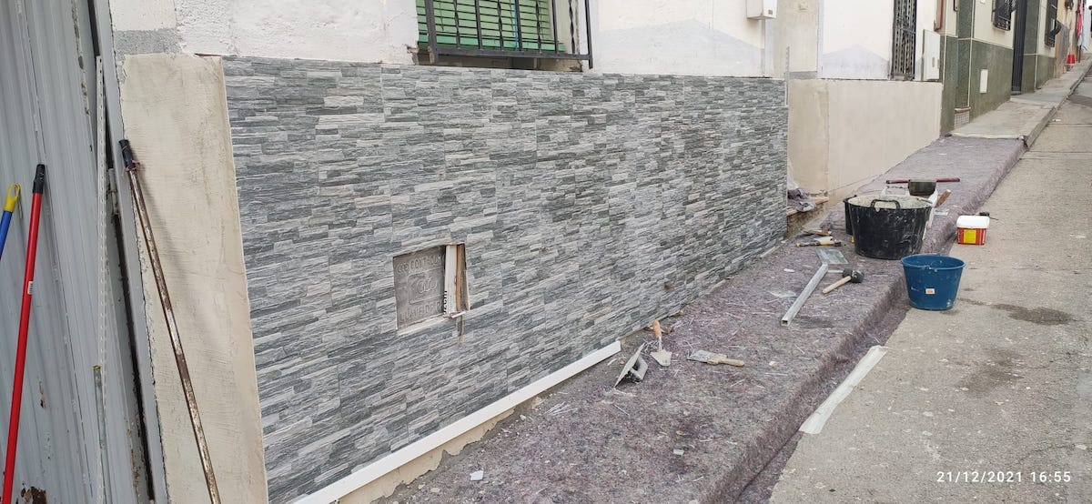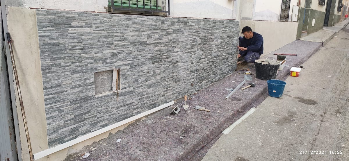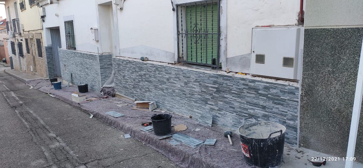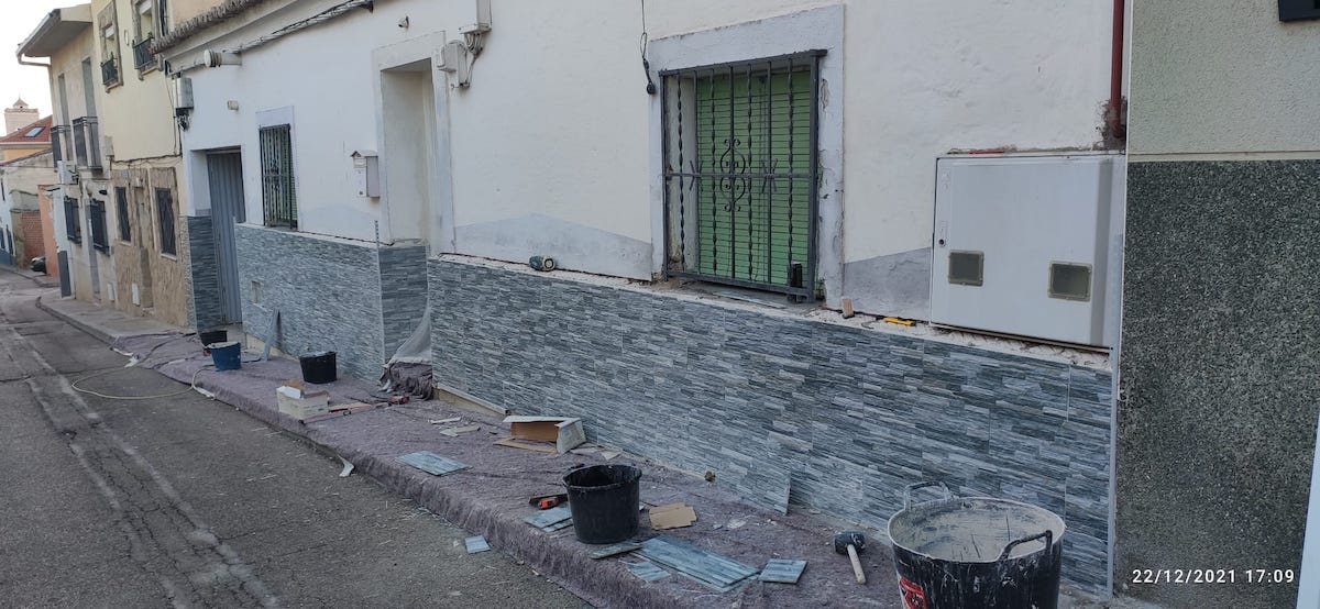 Trabajo de revestimiento y alicatado realizado en fachada en una vivienda en la calle Escuela, en Madrid.