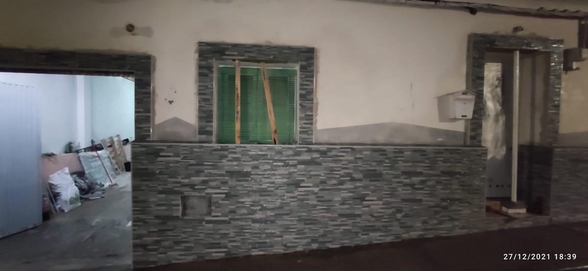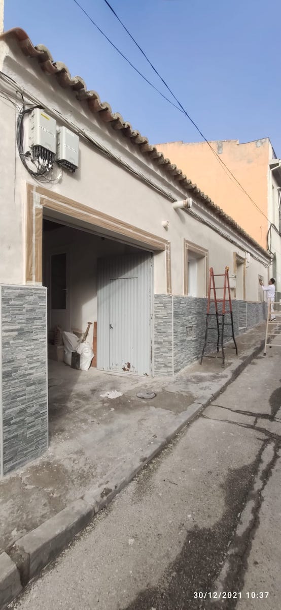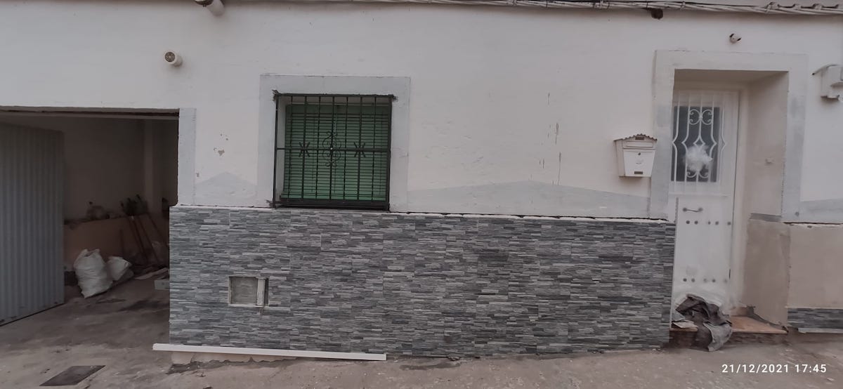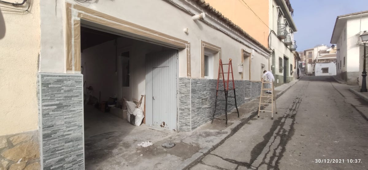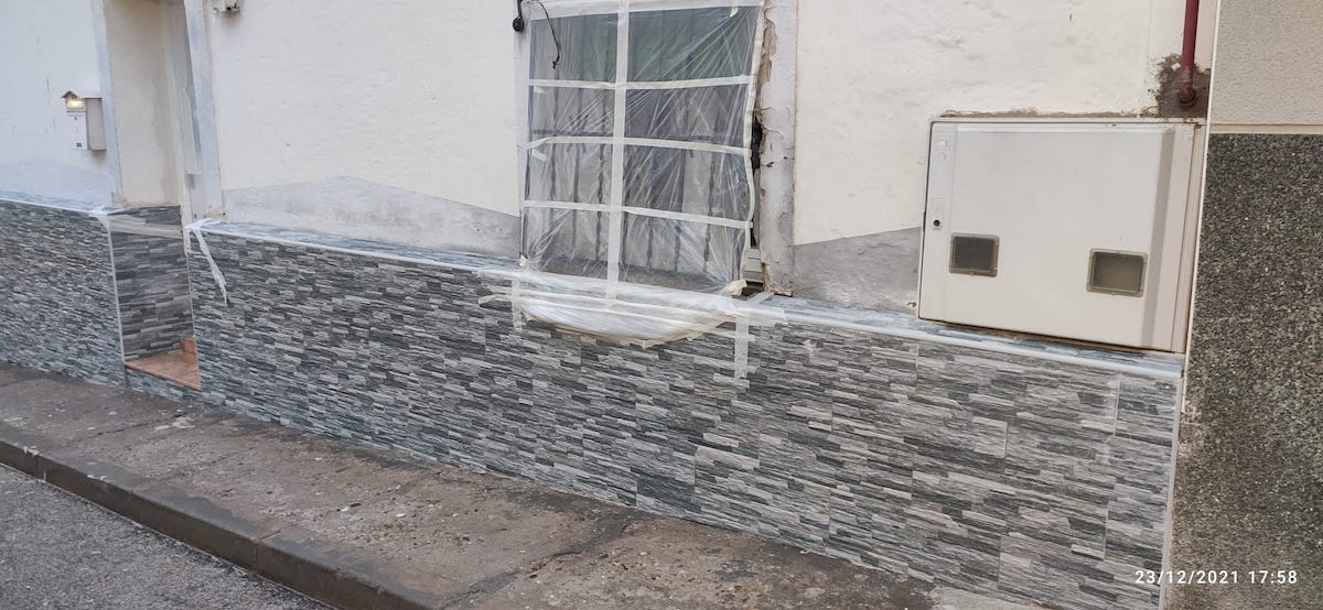Se enfoscó a nivel filos y paredes, se pintó una parte en gris crema y otra parte con azulejo en imitación a piedra, estilo rústico.
