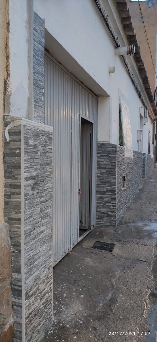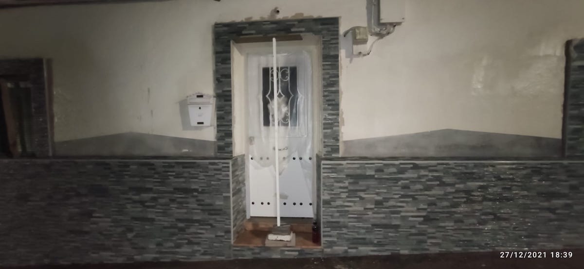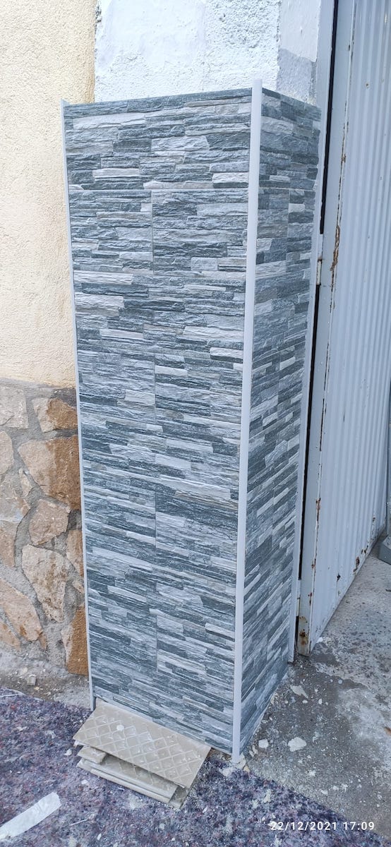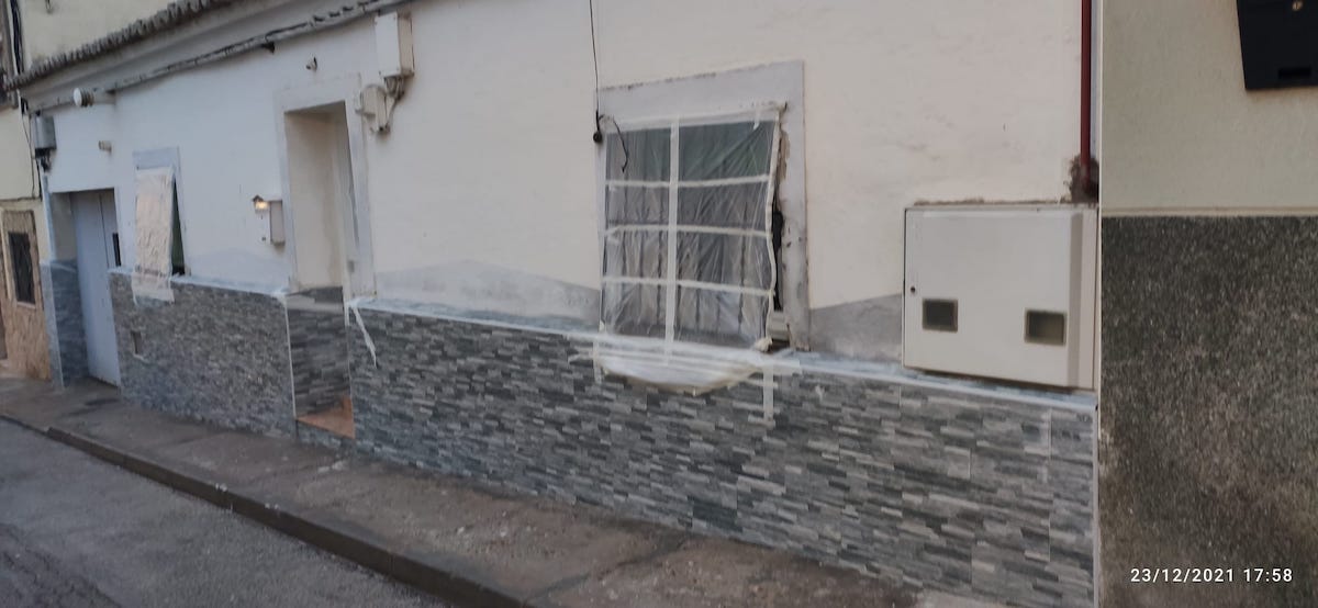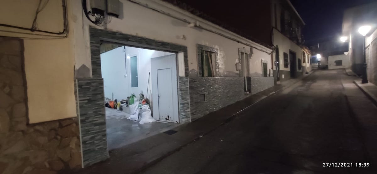 Se enfoscó a nivel filos y paredes, se pintó una parte en gris crema y otra parte con azulejo en imitación a piedra, estilo rústico.