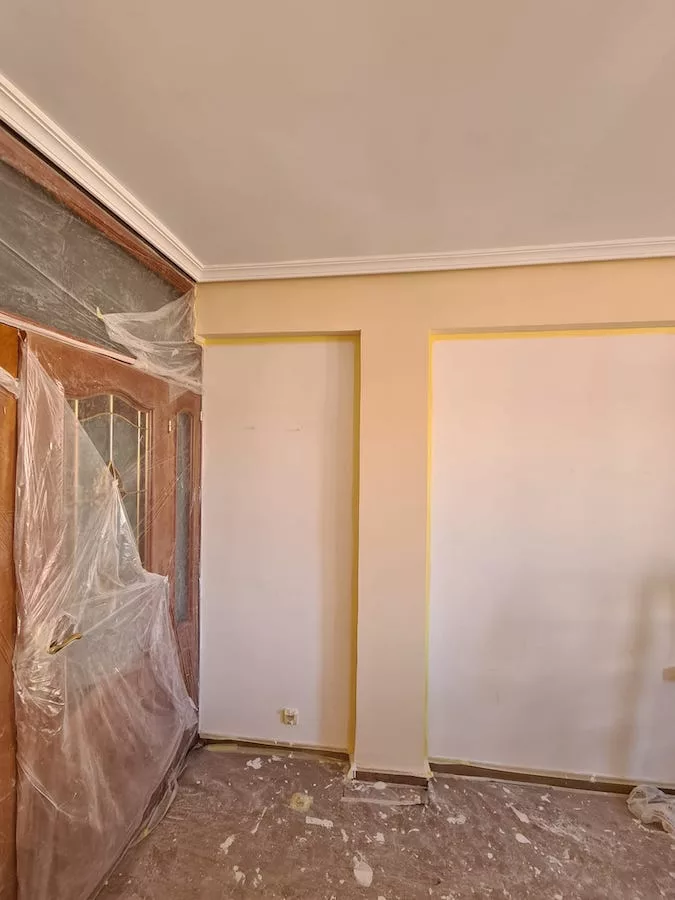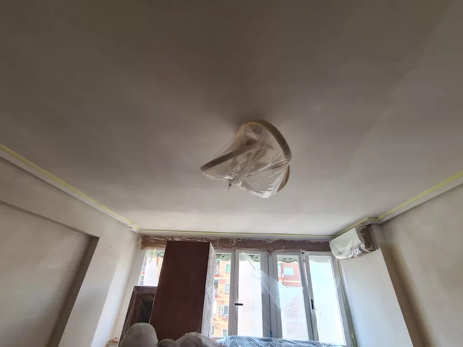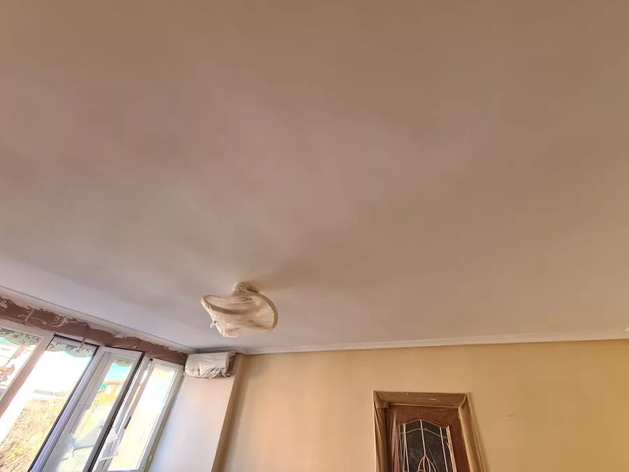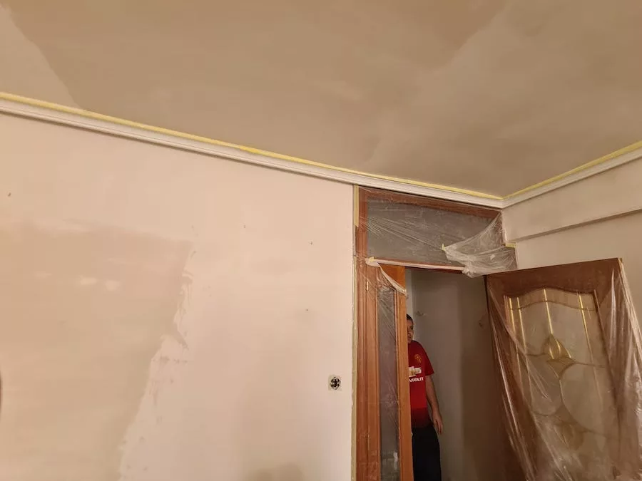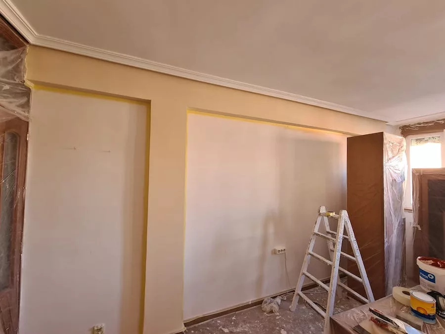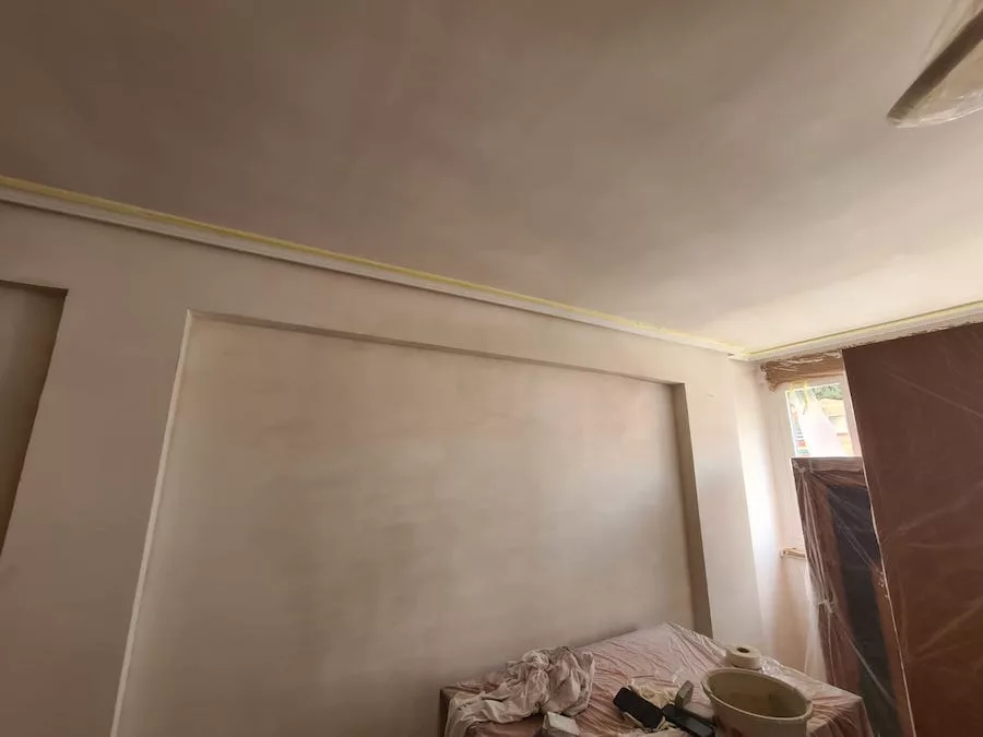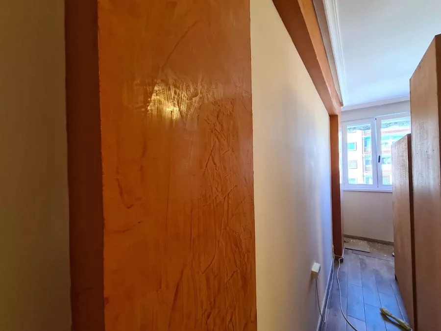 Trabajo realizado en piso particular. El modo en que nos contactaron fue a través de la tienda de pintura IMCASA. Le facilitamos nuestro contacto y al cabo de unos días comenzamos a realizar el trabajo. El servicio que solicitaba era colocar velo en la cocina, posteriormente la clienta nos propuso alisar el domicilio y realizar trabajo de diseño de interior en el salón (estuco), para conseguir mayor impacto del diseño que se pretendía, se aconsejó realizarlo en paredes independientes al salón, para evitar sobrecargar dicha estancia; también se realizó asesoramiento con respecto al tono del estuco buscando una combinación perfecta entre decoración y color del estuco. Finalmente, ¡Nos pusimos manos a la obra!